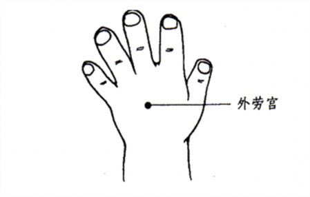 用拇指或中指端揉手背**与内劳宫相对处。约揉50~100次。