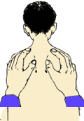 操作者双手四指轻轻扶住宝宝背部的两侧,双手拇指沿肩岬骨内侧由上向斜下方推(如图)。