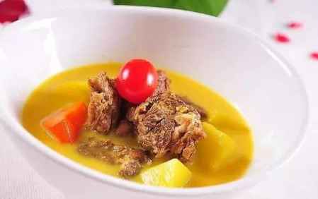3、锅中油加热放调料,加高汤,再加牛肉、咖喱粉一起炒,勾芡,炒匀即可盛盘。