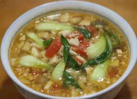 用料:蕃茄、新鲜杏鲍菇、青菜、肉末、盐、鸡精【肉末蕃茄杏鲍菇汤】▼