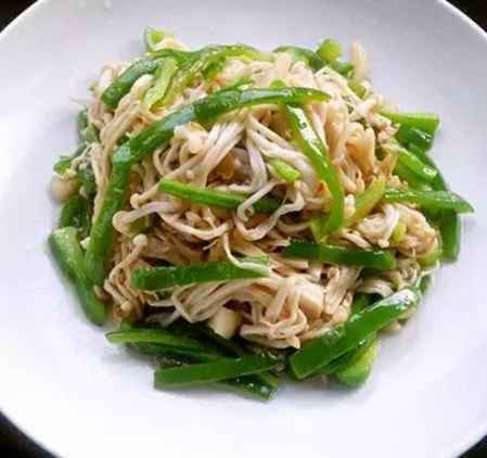 4.锅再次烧热加入少量食用油倒入金针菇翻炒半分钟左右,加入青椒丝、姜和蒜,加入适量盐,继续翻炒半分钟左右。