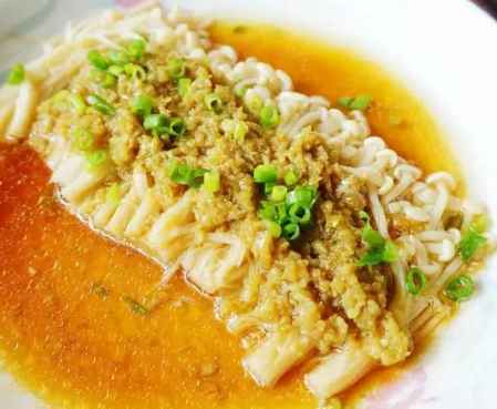 将蒜蓉酱直接淋在洗好的金针菇上蒸6-8分钟后取出,金针菇会自然蒸出水份,蒸出的汁水很甜,不要浪费~将汁水倒出,在汁水中加入生抽和糖,麻油,调好味道,不必太咸,再倒回金针菇盘子里面,最后撒上葱花,就完成了~