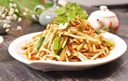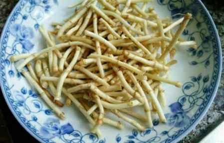 (4)大火烧热锅内的油,等油温稍降后倒入鱼腥草中,拌均匀即可。