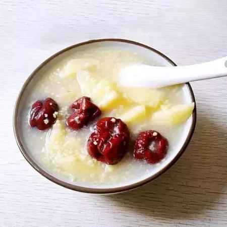 做法:500克苹果洗净,切块备用。30克山药、30克麦芽、10克芡实洗净与苹果一同入锅,加适量水,大火煮沸,小火熬煮1.5小时。
