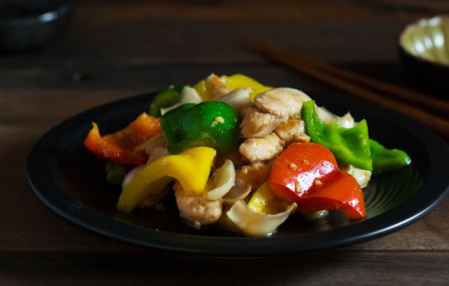 材料:鸡胸肉300克、三色椒各1/2个、鲜百合2-3个、蒜蓉2瓣、绍兴酒1汤匙、蚝油1汤匙、砂糖1茶匙、胡椒粉适量