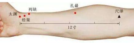 也可以将太渊穴(手腕内侧横纹处,桡动脉搏动处即为此穴)与尺泽穴之间连一条直线,然后将其分成12等份,在距太渊7份、距尺泽穴5份处即是此穴。