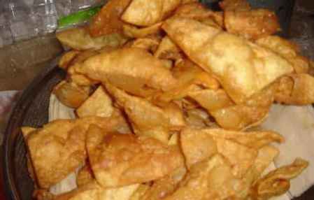 5、油烧热(油一定要多)放入一些切好的菱形片。不用一片片放,大量的往里倒就行,飘上来用筷子以搅就都分开了。可以将一块面片扔到油锅里是温度,立刻能飘上来,说明油温正合适。