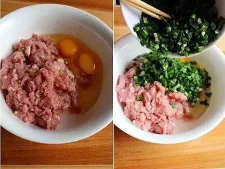 ② 在剁好的肉馅中打入两个鸡蛋,倒入碎韭菜。