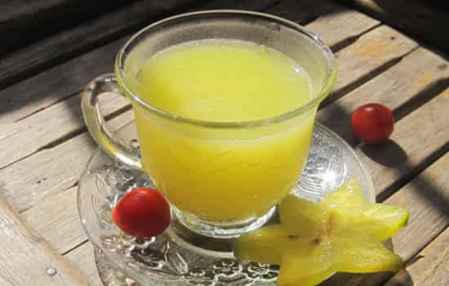 杨桃50g、蜂蜜适量。准备新鲜杨桃。洗干净去棱切片。放入调理机。慢档榨汁。加入蜂蜜效果更好,止咳,生津消烦。
