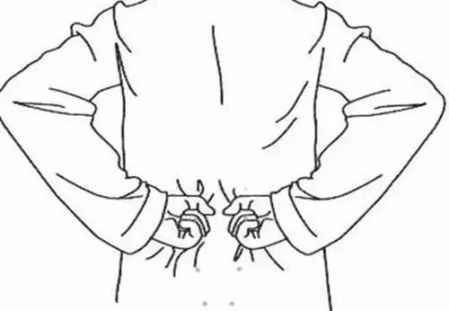 两手轻握拳,拳眼向上,以掌指关节突出部分在两侧腰眼处作旋转揉摩。先以顺时针方向旋摩18圈,再以逆时针方向旋摩18圈。两侧可同时进行,也可先左后右进行。