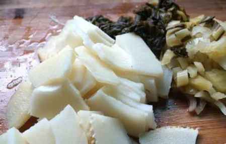 4、切丝:先将春笋按照切片的方法切成均匀厚度的片,再斜切成丝。