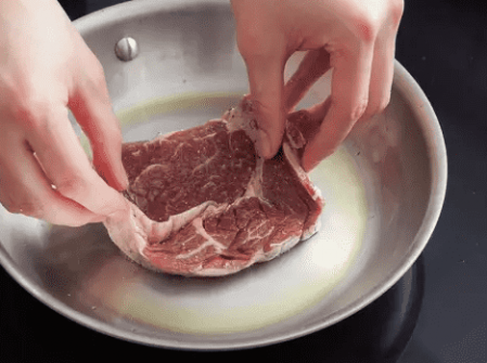 储热较强的锅,如铸铁锅、三层或五层不锈钢锅,受热才会足够充分、目的是使牛肉表面上色,中间尽可能保持生一点,完整烹饪一块牛排应该先煎后烤,而非靠长时间的煎来让它熟透,这样容易口感变老。