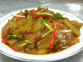 材料:冬瓜一斤,青,红辣椒各两个,豆瓣酱一大匙