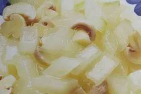 4. 炒锅放油烧热,放入黄豆芽汤、口蘑、冬瓜块、料酒、精盐、味精,旺火烧沸,改小火,烧至口蘑、冬瓜入味,用湿淀粉勾芡,即可出锅装盘食用。