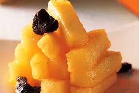 3. 橙汁(也可用橘汁)淋在白糖腌过的冬瓜脯上浸泡,捞出,装盘即可。