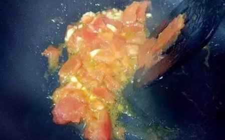 4.下切成大块的番茄,用锅铲压着炒软