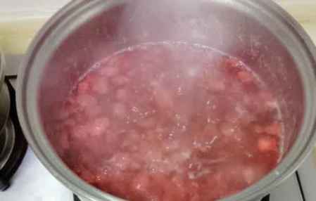 8、把草莓冰糖水倒入锅中,中火烧开转小火,之后就一直用小火熬。在煮的过程中,要注意。拿勺子把煮沸之后的一些浮沫过滤掉,因为会影响口感,你会发现滤掉一层浮沫之后一会儿它还会有,那就一直滤掉,直到最后做完。