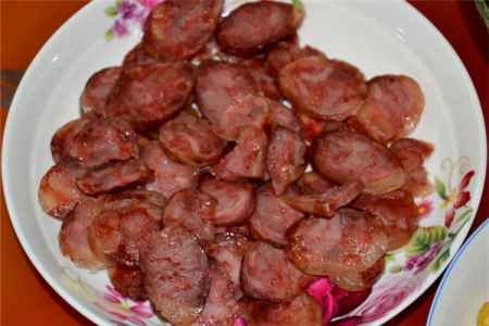 首先清洗猪肠和猪肠衣。其次将猪后腿肉切成肉片。然后加盐,白酒腌制十分钟,再加入醪糟汁,五香料粉等腌制猪肉。接着将猪肠一端扎紧,另一端套入竹筒**肉片。最后进行风干晾晒。