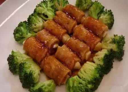 5、将培根卷放进煎锅煎至金**放盐调味即可