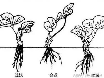 苗生长3~4月后即可进行起苗移栽,株行距掌握在20~30厘米。修剪掉大叶片,栽种深度按上图所示,栽种在松软的土壤中,种好后浇透定根水,放在半阴的地方,经过几天的缓苗,草莓就能顺利成长了。