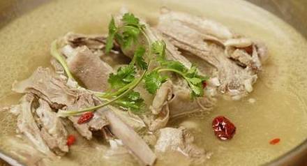 2.锅内放原汤,加水稀释投入盐面、花椒面、姜面、葱花、芫荽调成汤,再放入羊肉块(或片)入碗即成