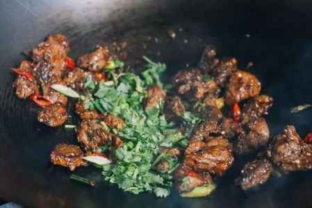 3.用大火将炒锅加热,直到它开始冒烟,倒入两勺油,放入腌好的羊肉,翻炒至羊肉呈棕色