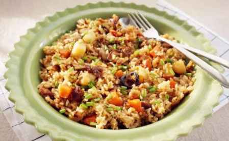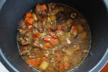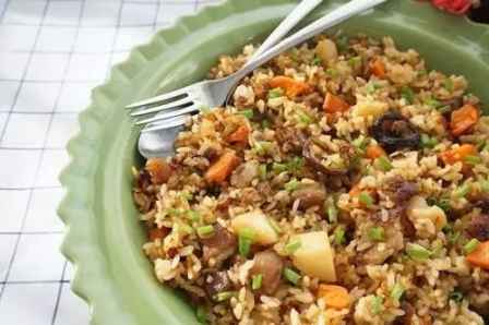 8.大米用清水淘洗干净,放入适量的清水,将炒好的食材连同汤汁一起倒入大米上,放入几朵洗干净的干香菇(可以不用泡发),按下煮饭键即可