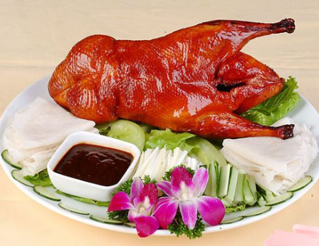 北京烤鸭是北京比较有名的食物,后来慢慢传入外省,现在已经是人尽皆知的美食。北京烤鸭以其味道可口、色泽红艳、肉质鲜嫩多汁出名,正宗的北京烤鸭选用品种名贵的北京鸭,这种鸭子从小吃肉长大,口感非常好。
