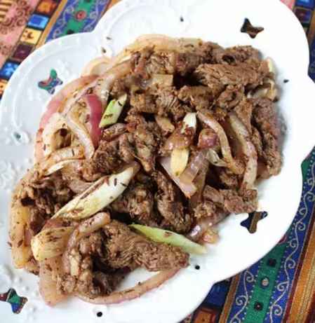 4.倒入洋葱和大葱段翻炒至软,倒入羊肉,加入孜然粉,盐快速翻炒均即可。