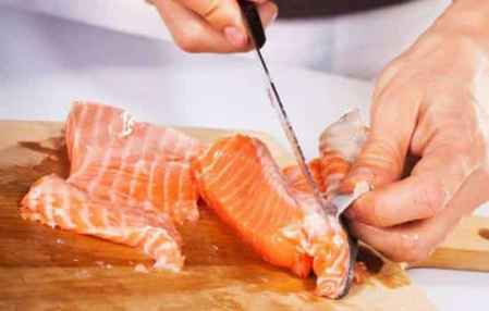 如果不太接受生吃方法,或不能完全保证三文鱼非常新鲜的情况下可以选择熟吃的方法,但为了尽量保留其中的ω-3多不饱和脂肪酸,在温度和烹调时间上要有所控制,最好是五成熟即食。推荐两种吃法:一种是涮食,在大约70度左右的汤中,薄的肉片沾过即可食用;另外可以微煎,将三文鱼切近一厘米左右的厚度,在少油的煎锅中将两面微微煎黄即可,鱼块中间的肉质已经半熟断生,还会保留一定的ω-3多不饱和脂肪酸。