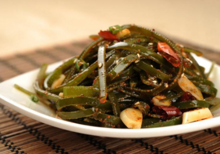 4、加醋窍门:煮海带丝的时候加入适量的白醋,不仅能去除海带丝特有的腥味,也能促使海带更容易煮软,颜色也好看,喜欢更软的口感可以适当延长煮制的时间。若放几棵菠菜,海带易烂。