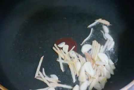 3. 锅中放入过多油,油热放入蒜片与姜丝,煸香。