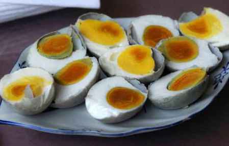 将鸭蛋50个洗净后晾干待用。再用盐850克加扑茶250克,加生米250克,在旺火上煮成浓汁约200毫升。最后将这种咸茶汁和黄酒75克一起倒入黄泥或红泥中拌匀,均匀地裹满鸭蛋的周身,装入罐内密封。一个月后即可取出煮食。也可以先将鸭蛋洗净晾干,再用开水将干透的红土烫浸成糊状。将鸭蛋在泥糊中周身裹满,两端蘸盐后放入罐盐后放入罐中封紧罐口。半个月后即可取出煮食。