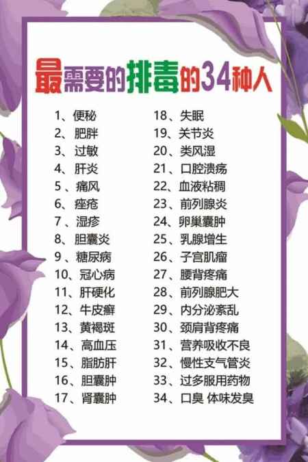 ①便秘;②痔疮;③肠炎; ④体臭口臭; ⑤面部浮肿、身材肥胖; ⑥长斑长痘、皮肤暗黄起皱 ;⑦**不调;⑧妇科、**疾病;⑨更年期提前; ⑩手脚冰凉,气血不足**。