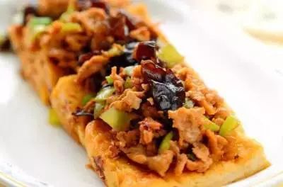 4.煎好的豆腐盛出,用原锅原油先下葱花,再下肉末。
