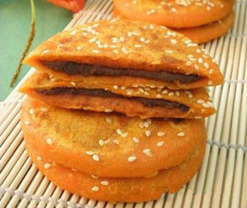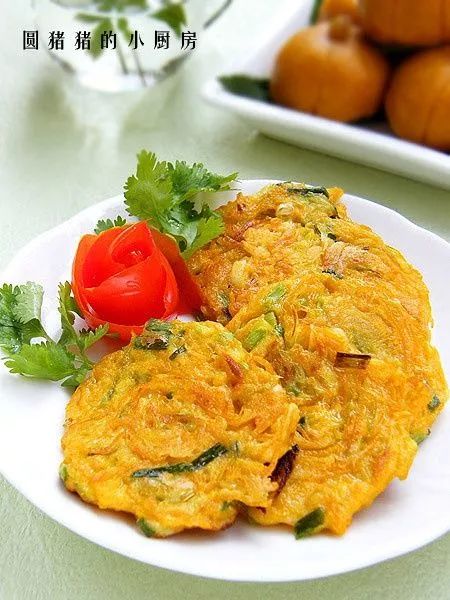 8.平底锅内放油,下入胡萝卜豆沙饼,小火将其煎黄一面后翻面,最后煎至两面金黄熟透即可。