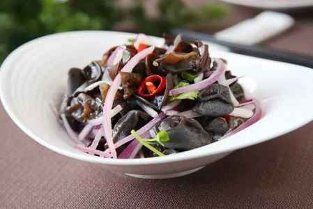 用料:**耳150克,洋葱半个,柿子椒半个,红椒半个,花椒1小勺,干辣椒2个,食盐1克,生抽1小勺,醋1小勺,植物油1大勺