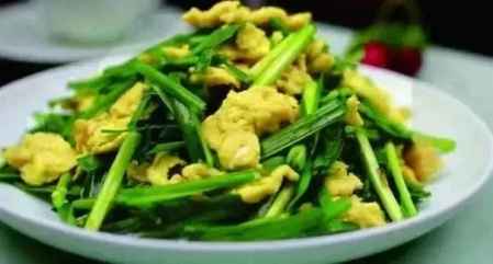 ②韭菜炒鸡蛋:新鲜韭菜100克,洗净切碎,鸡蛋3只(去壳),同切碎之韭菜捣匀,用素油、食盐同炒至熟佐食。