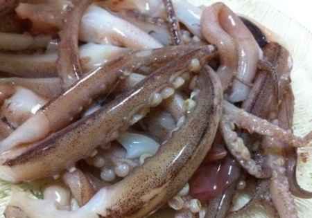 3、鱿鱼须上的触爪因为有吸盘口(钙化的软骨)所以要认真用碱搓洗就可以了。