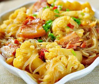 6.炒好的菜花粉丝转入砂锅,加入适量高汤,煮开即可趁热食用。