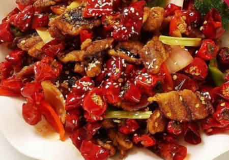 辣子鸡 ,是一道经典的川渝地区的特色传统名肴。一般以整鸡为主料,加上葱、干辣椒、花椒、盐、胡椒、味精等多种材料精制而成,营养丰富,味道鲜美,虽然是同一道菜,各地制作也各有特色。辣子鸡因各地的不同制作方法也有不同的特色,深受各地人们的喜爱。此菜成菜色泽棕红油亮,麻辣味浓。咸鲜醇香,略带回甜。