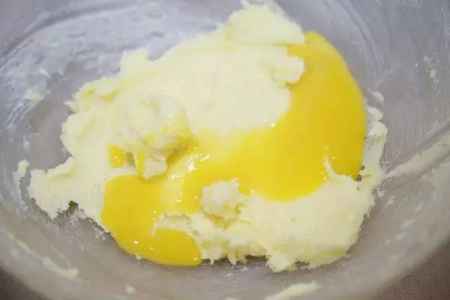 3.蛋黄打散后分次加入,并用打蛋器搅打均匀(每次都要等蛋黄和黄油完全混合均匀再加入下一次)。