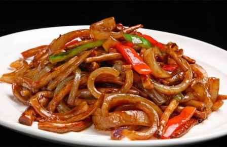 食材:炸猪皮、洋葱、青椒、油、盐、陈醋、红油豆瓣酱、生姜