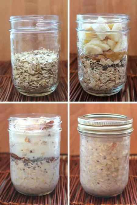 香蕉切片,拿出一个罐子倒入燕麦片,放入香蕉片,加入牛奶,盖上盖子。