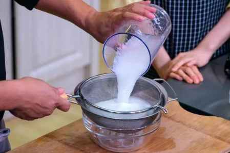 3、双层滤网过滤萝卜泥。双层滤网过滤萝卜泥,可留住更加细腻的萝卜泥。