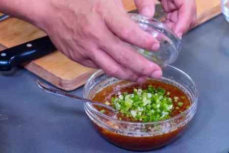 10、在酱汁中加入少量芝麻油,蒜末,葱花。
