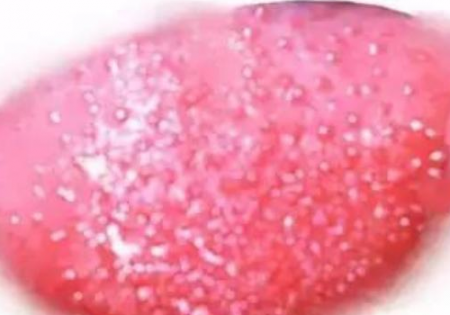 发病初期,出疹之前即可见舌**红肿肥大,突出于白色舌苔之中,称为“白色杨梅舌”。3~4天后,白色舌苔脱落,舌色鲜红,舌**红肿突出,状似杨梅,称“红色杨梅舌”,同时伴有颌下淋巴结肿大。