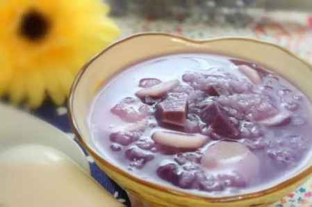 3.米粥熬到20分钟时,放入紫薯和山药,最后15分钟放入冰糖即可,一共需熬制1小时