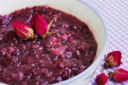 4.粥煮开后,将红枣加入一同熬煮,至米粒涨开,煮至粘稠时,将红糖放入,溶化,起锅前将玫瑰花瓣撒入,搅拌均匀即可