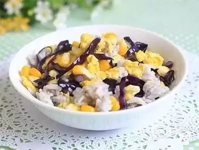 食材:米饭1碗、紫甘蓝30克、鲜玉米1个、食盐1克、葱适量、橄榄油适量